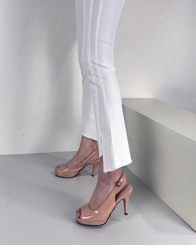 피부톤과 비슷해 다리를 더 길어보이는 효과를 주는 스킨베이지 컬러예요 🫶🏻 가보시굽+쿠션으로 편한 착화감의 에나멜 토오픈 샌들힐💜