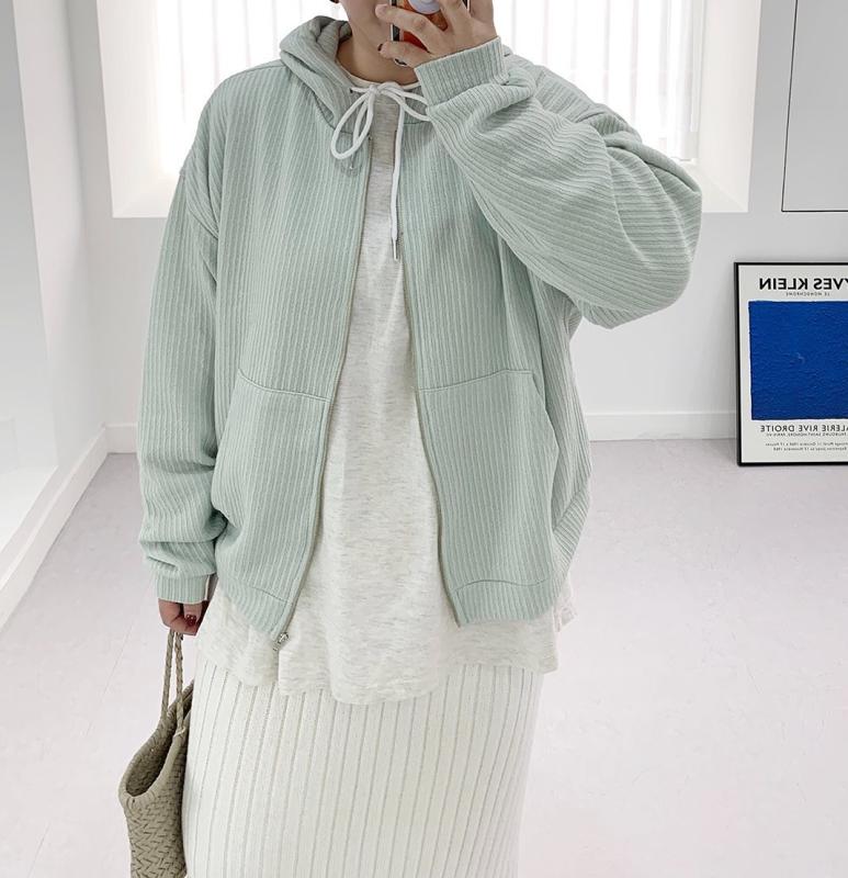 이렇게 여유있고 편안한핏의 후드집업 쭈리로는 참 많은데 골지짜임에 니트집업은 흔하지도 않고 두가지 사이즈까지 나오긴 어렵거든요 💚 44-99까지 함께 입어요 !