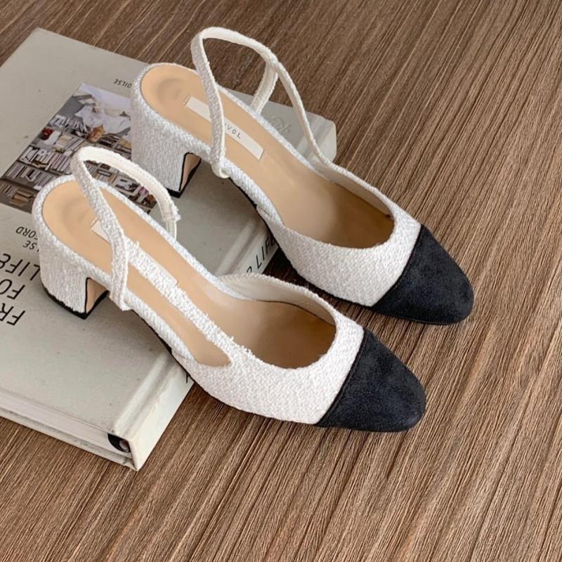 트위드 원단이 너무 예쁜 통굽 미들힐 슬링백