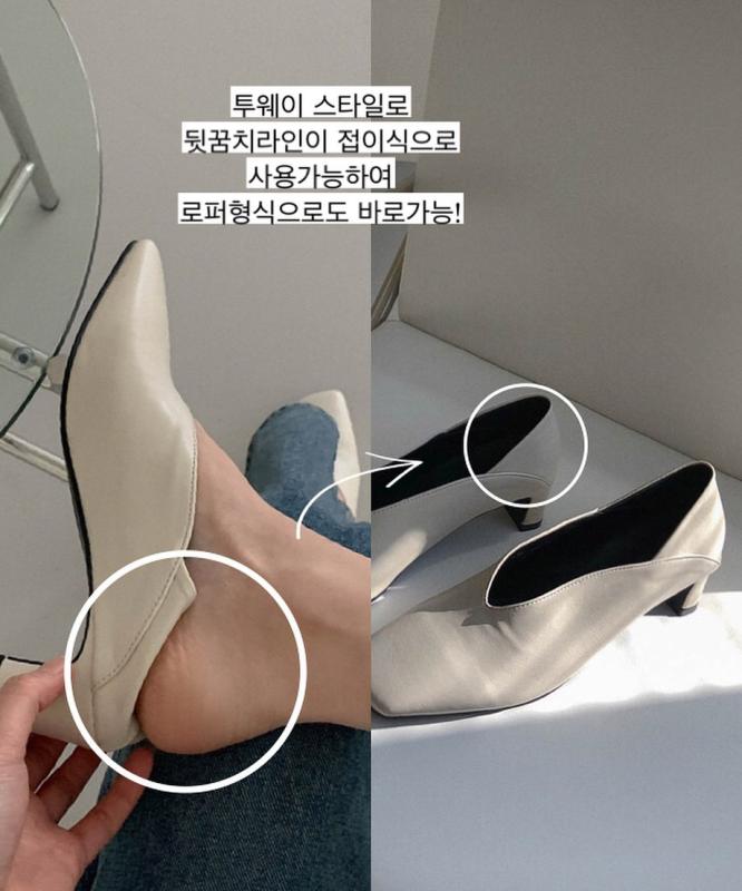 뒷꿈치 라인이 접이식로 편하게 신을수 있는 큰 장점과 5cm 미들굽으로 더욱 편하게 신을수 있는게 장점♥️