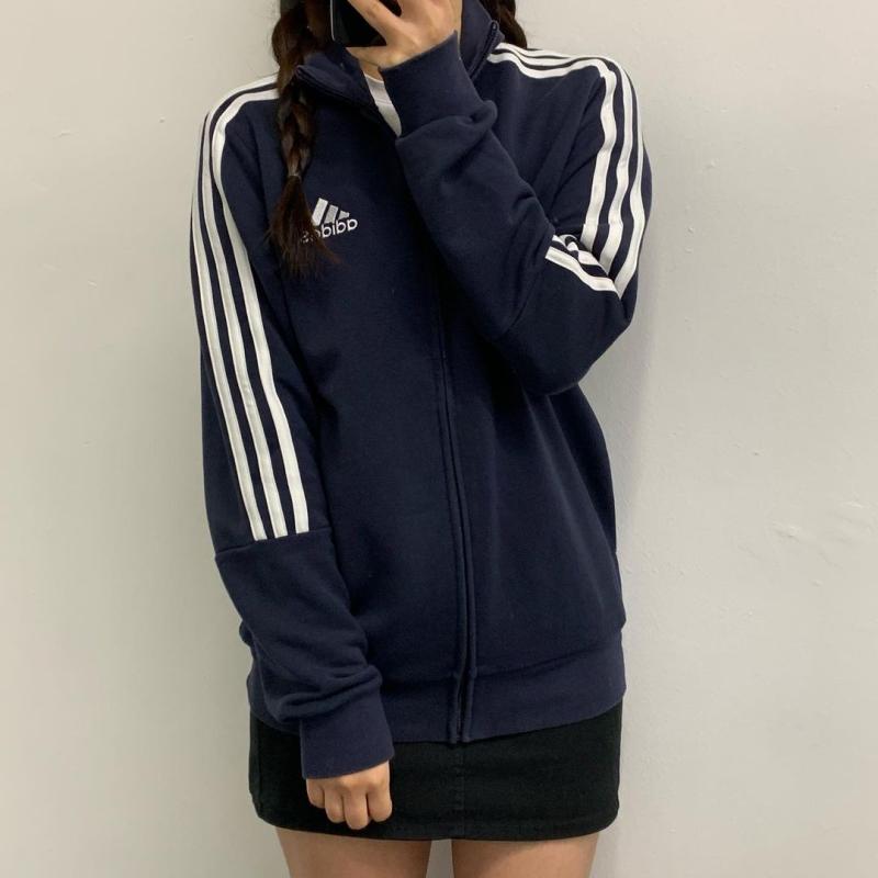 -네이비에 깔끔한 화이트 자수로고와 소매 삼선띠가 돋보이고 데일리로 활용도 좋은 아디다스 집업 입니다.