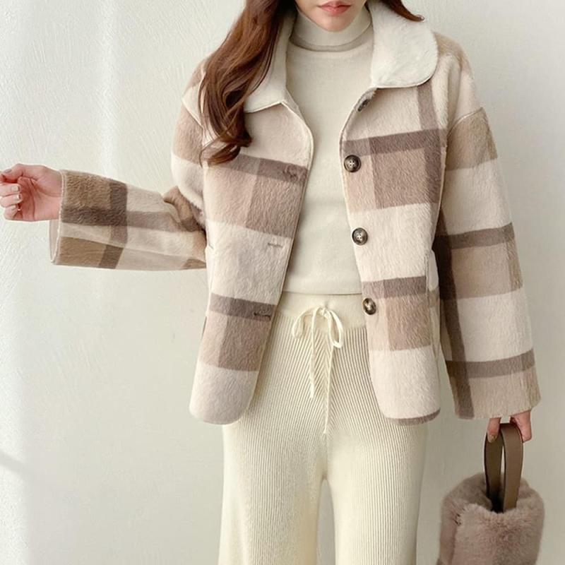 부드러운 에코 퍼와 둥근 카라로 여성스럽고 체크무늬로 어디든 코디하기 좋은 자켓 겸 코트입니다.